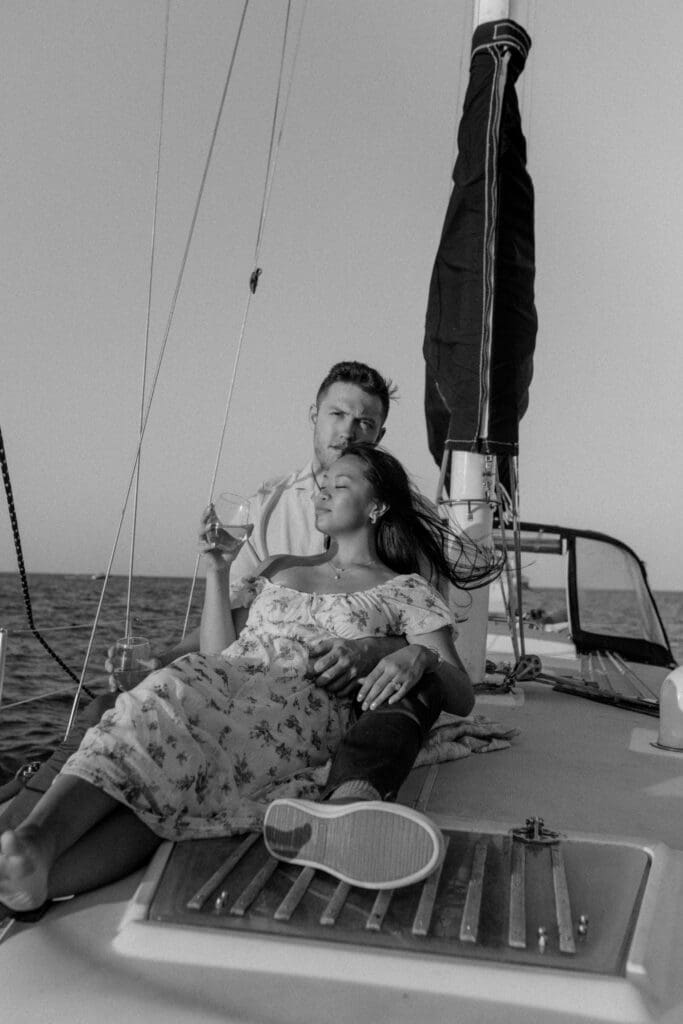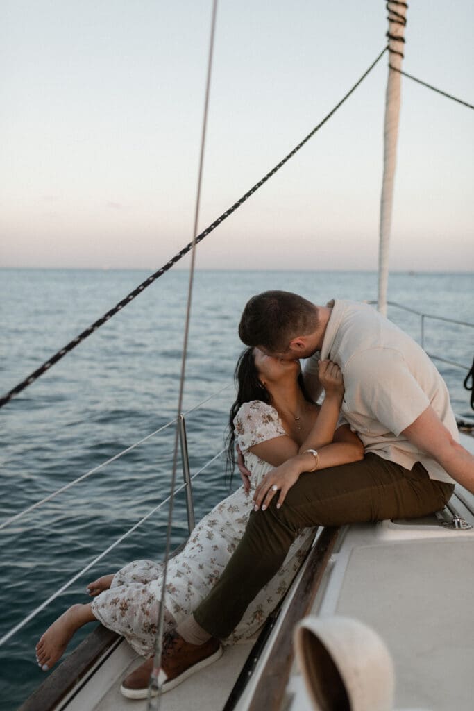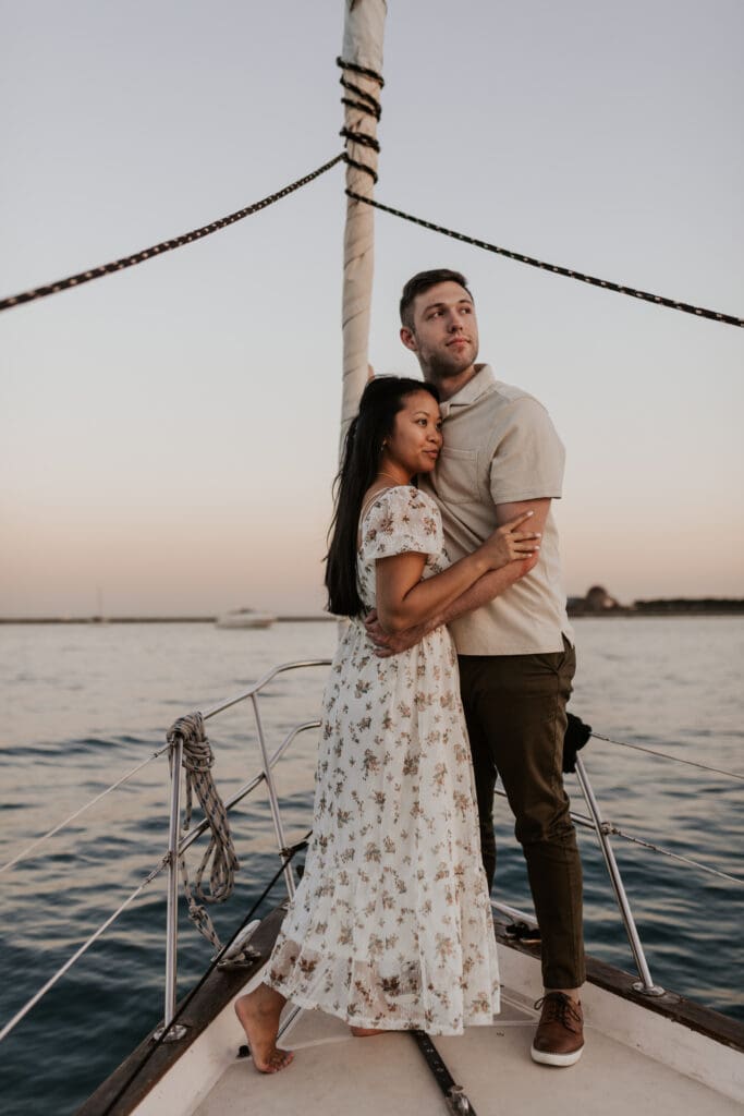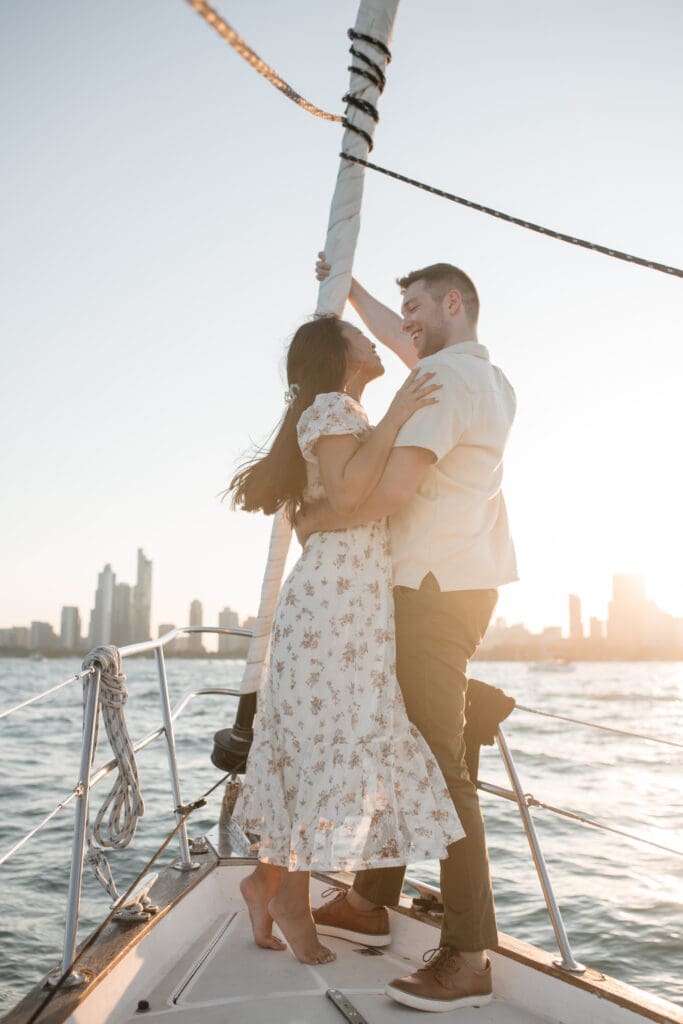 As a traveling Catholic wedding photographer, I adore documenting love stories that feel timeless and deeply personal. And it is a total dream when I get to travel for engagement shoots too. This waterfront engagement shoot in Chicago was the perfect mix of romance and adventure—intimate moments on the deck, laughter carried by the wind, and a sunset that painted the city in gold.